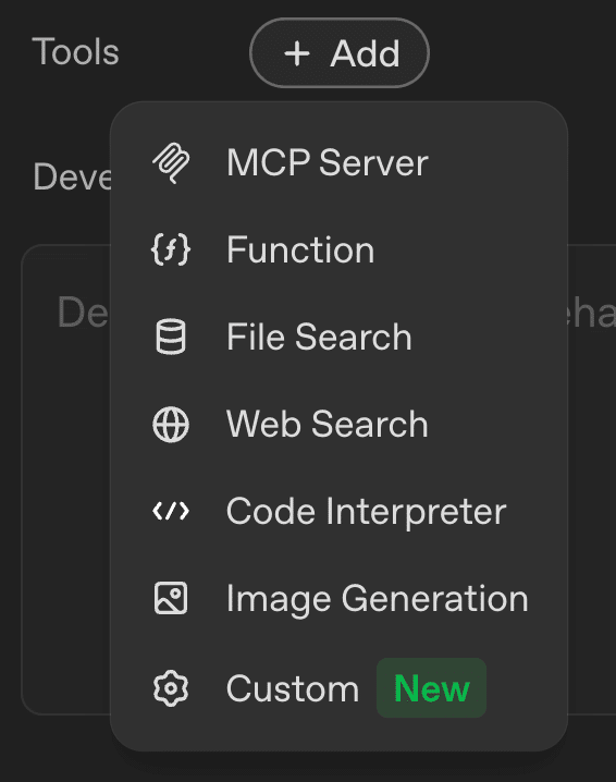 Tools: 外部のツール(API)をAIが呼び出せるようにする機能です。Web searchやCode Interpreterといった標準ツールに加え、独自のカスタムツールも登録できます。
