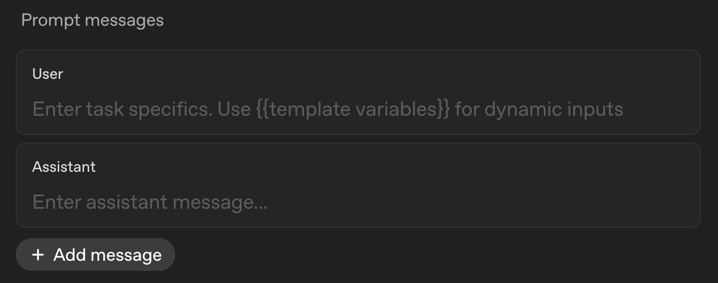 Prompt messages: 実際にユーザーが入力するような、タスク固有の指示や質問を記述します。
