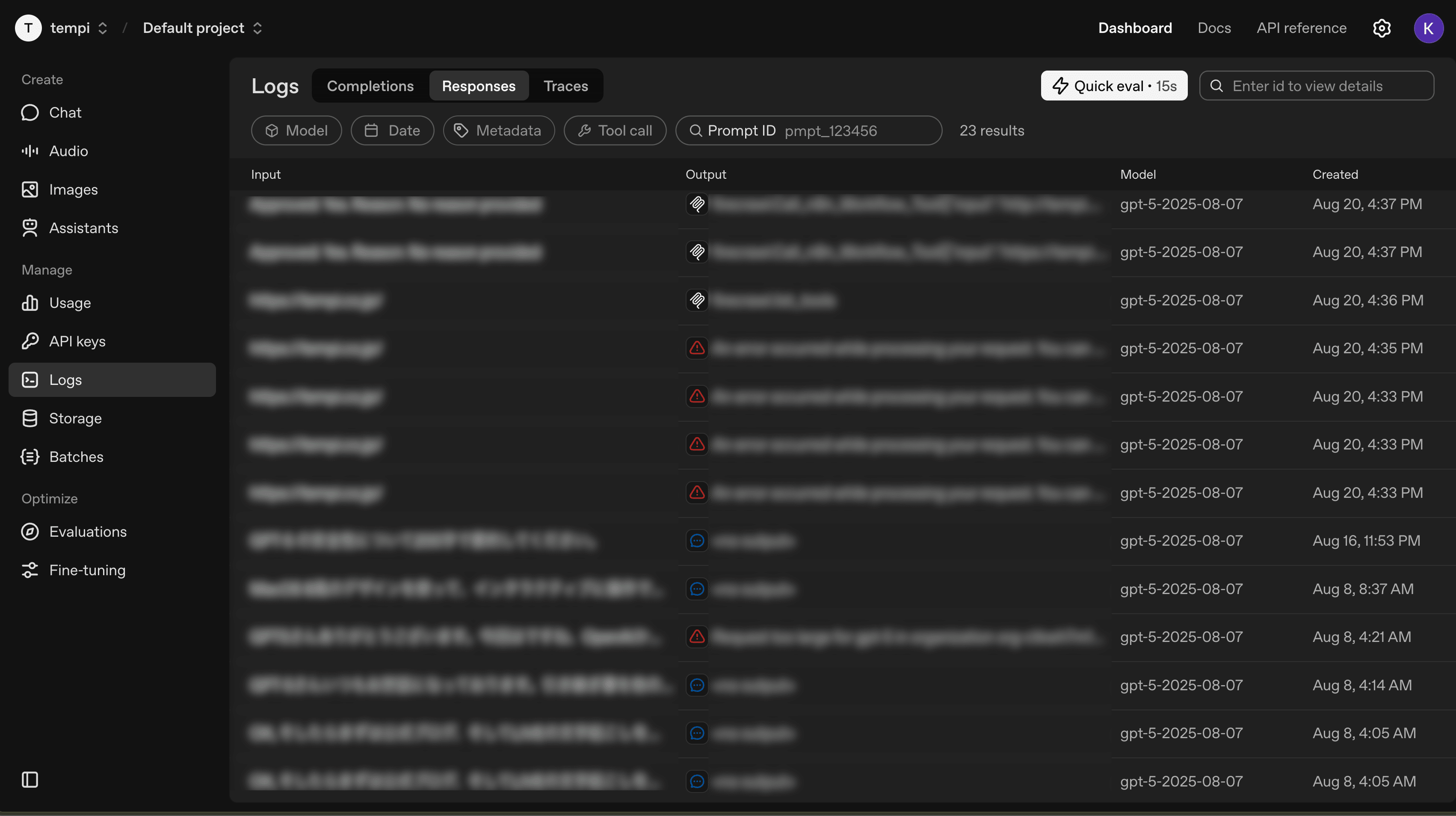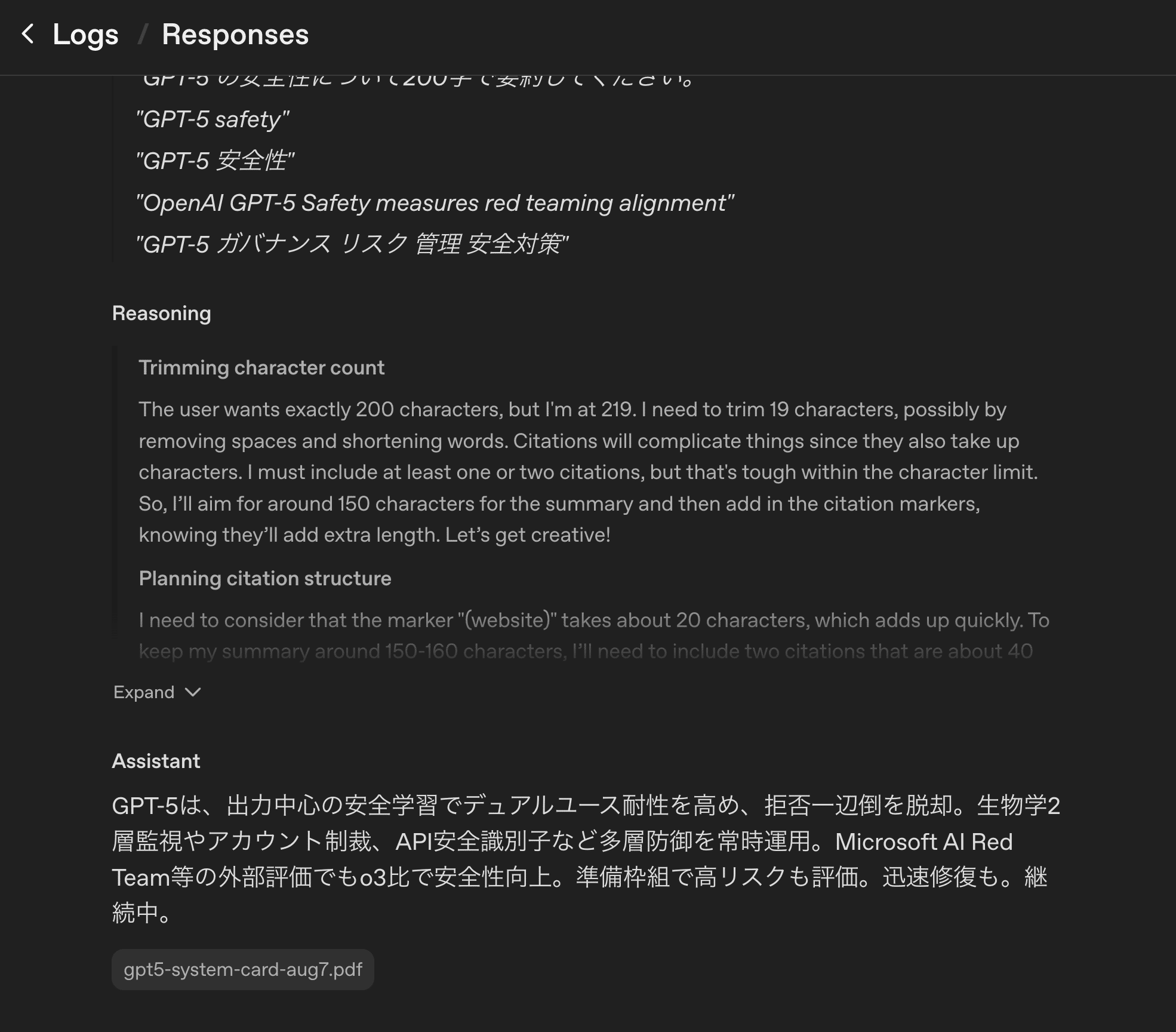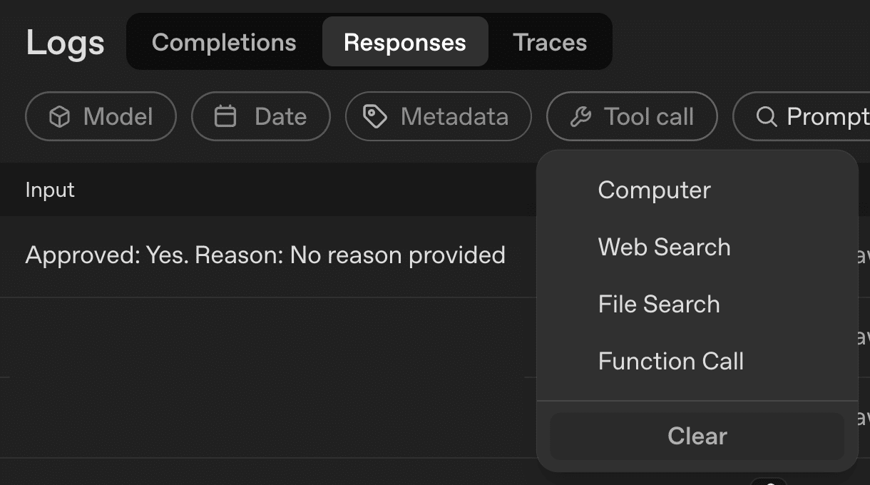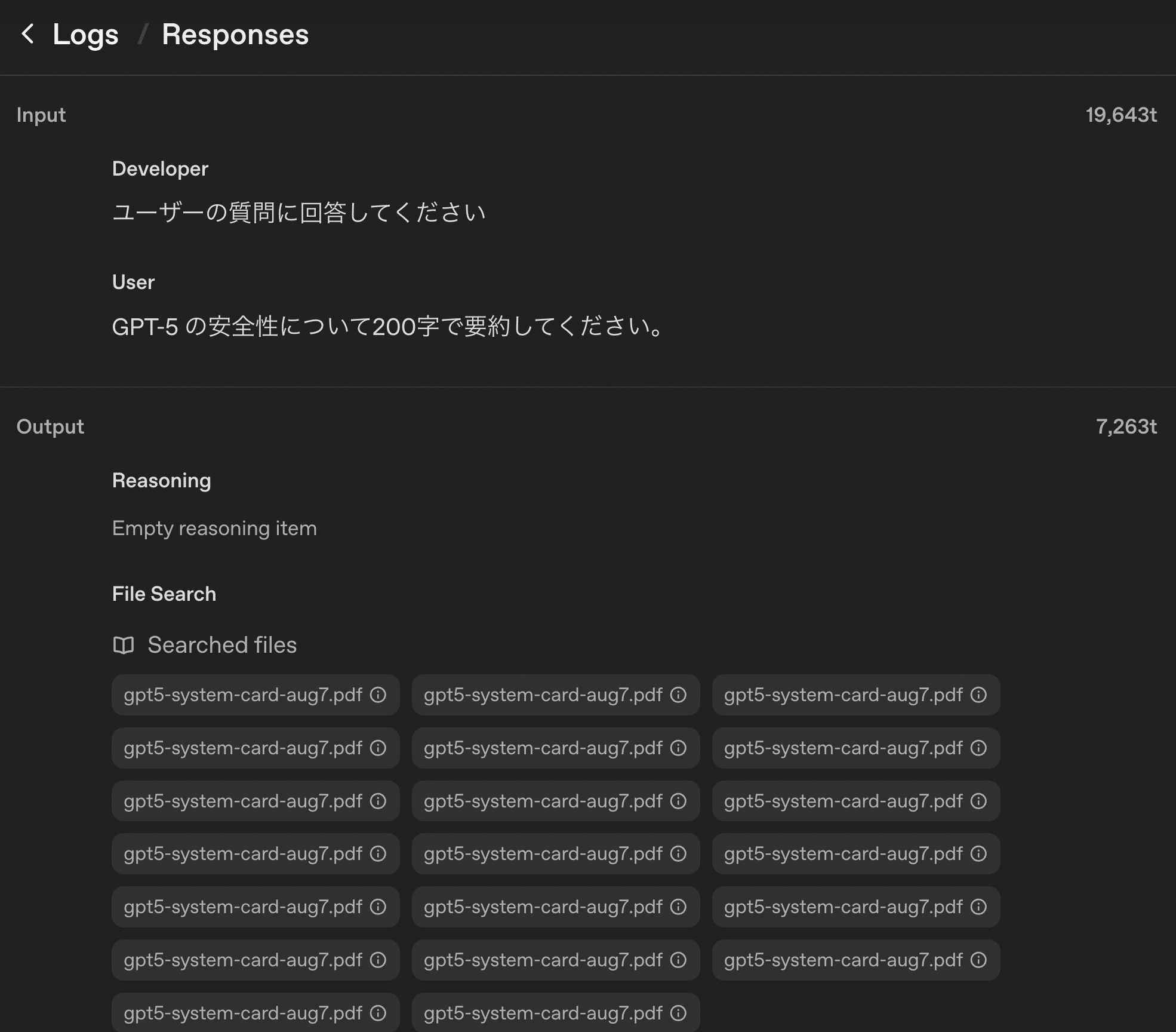 特に重要なのが「Responses」タブです。ここでは、新しいResponses APIでのやり取りが記録されており、以下のような詳細な分析が可能です。
