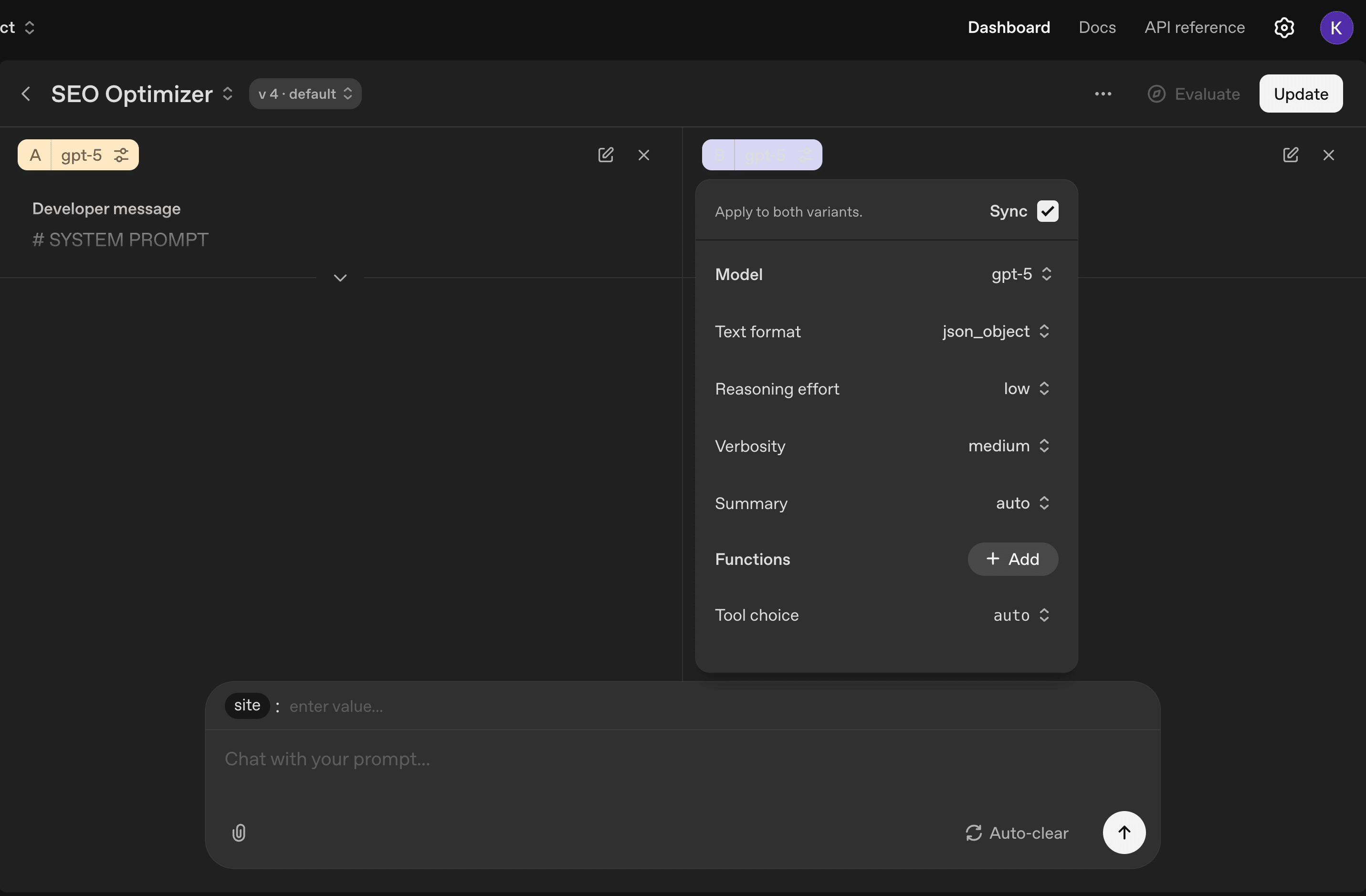 画面右側にはAIとの会話結果が表示され、上部には作成したプロンプトのCompare(A/B比較)やOptimize(自動最適化)、Evaluate(評価)を行うためのボタンが並んでいます。