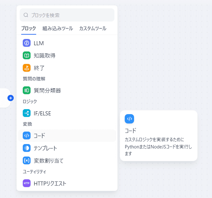 ワークフローの新規ブロックを作るタブから選択できる、独自の処理を実装するためにPythonまたNodeJSコードを実行する機能です。