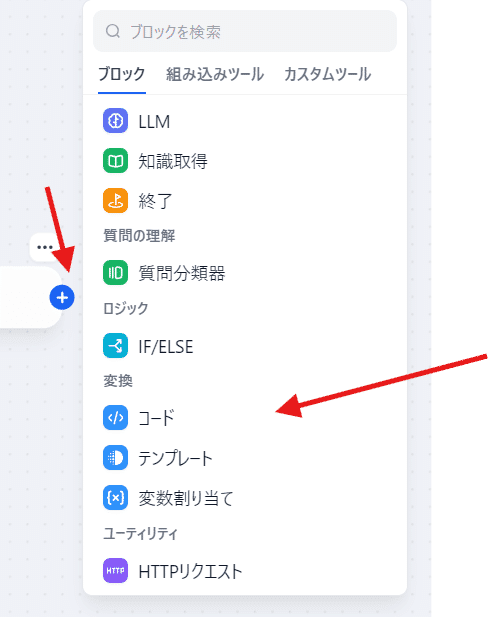 次に、表示されている全てのノードを消してから+のマークを押してブロック選択タブを開き、コードを選択してください。