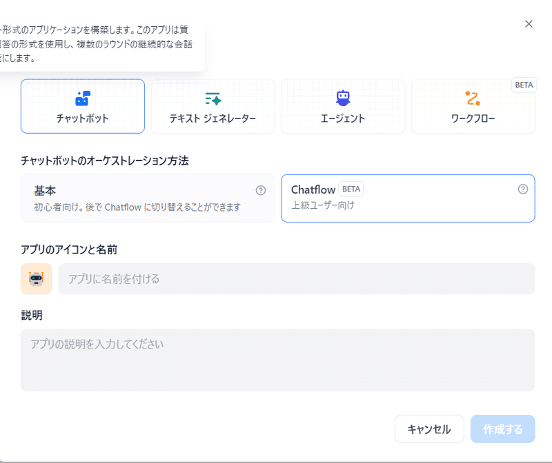 新しいアプリの作成からチャットボット→Chatflowを選択し、名前を入力して作成をするをクリックしてください。