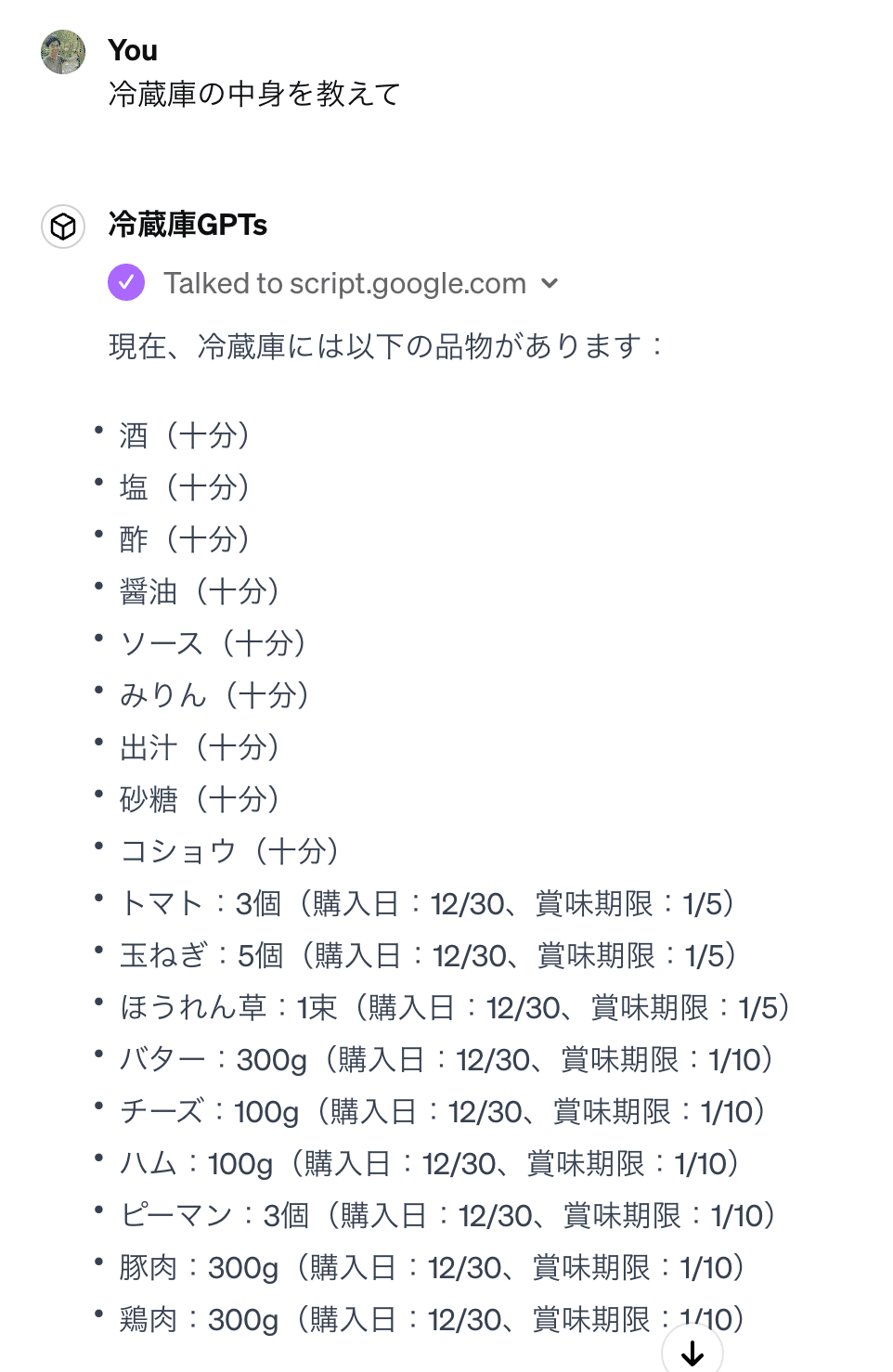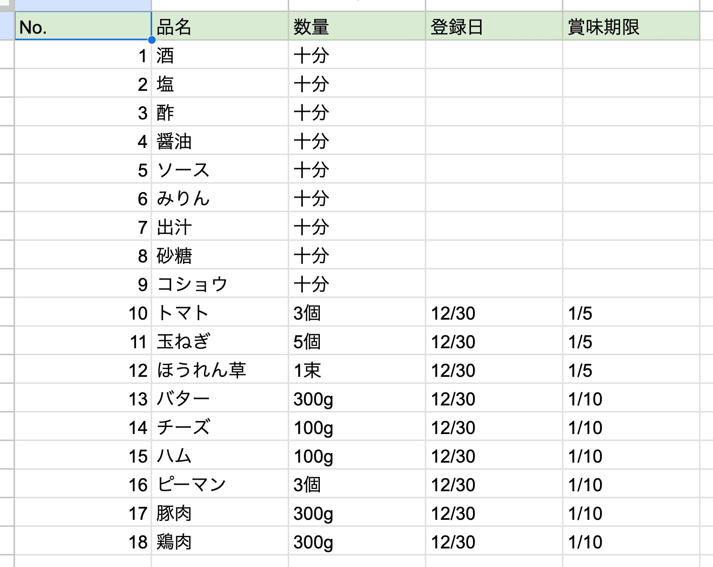 今回はGoogleスプレッドシート上で手動で食材を管理していますが、データベース管理が自動でおこなわれる未来で本領発揮することを想定しています。