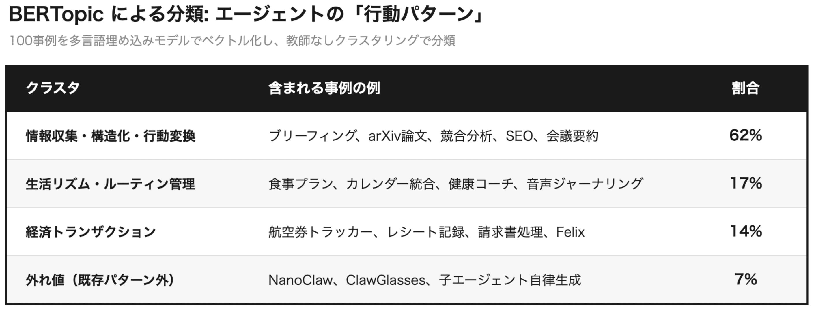 マーケティング・リサーチ・教育は100%がこのクラスタに入った。OpenClawの最も多い使われ方は「自分の代わりに調べて、まとめてくれる」機能。