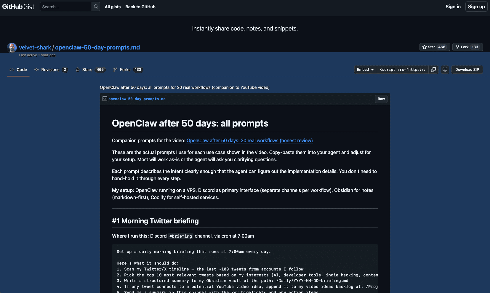 20のワークフローすべてのプロンプトがGitHub Gistで公開されており、コピペでそのまま使えます。