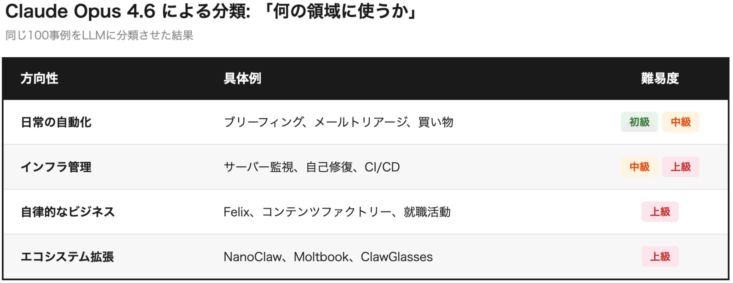 世界中のコミュニティから活用事例を100件収集し、機械学習(BERTopic)とLLM(Claude Opus 4.6)で分類しました。後半では、筆者が実際に運用している「朝の機会スキャン」の構築手順を紹介します。