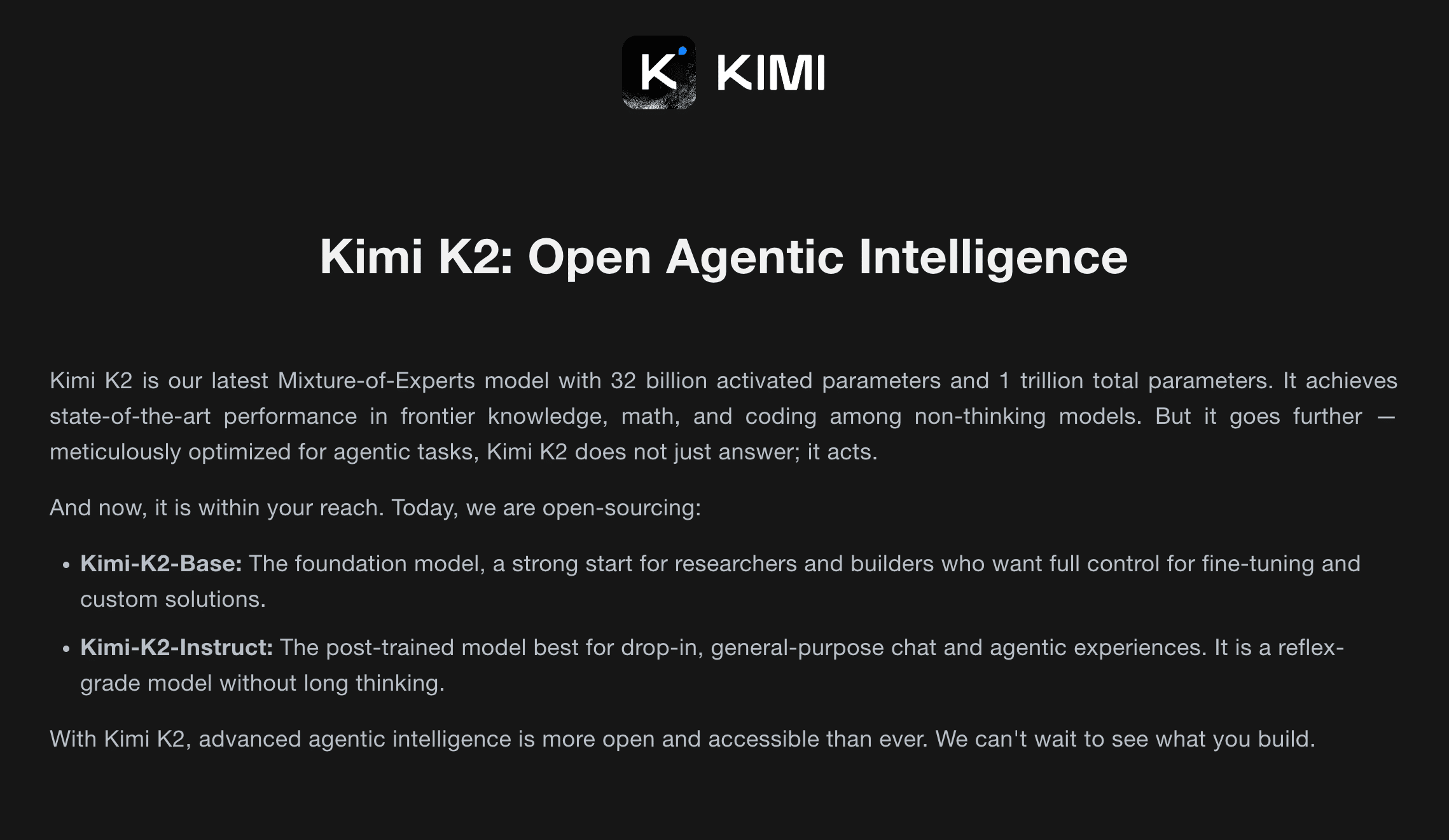 オープンソースなので、誰でもモデルのデータをダウンロードして利用できます。研究向けの「Kimi-K2-Base」と、対話や指示が得意な「Kimi-K2-Instruct」の2種類が公開されてます。