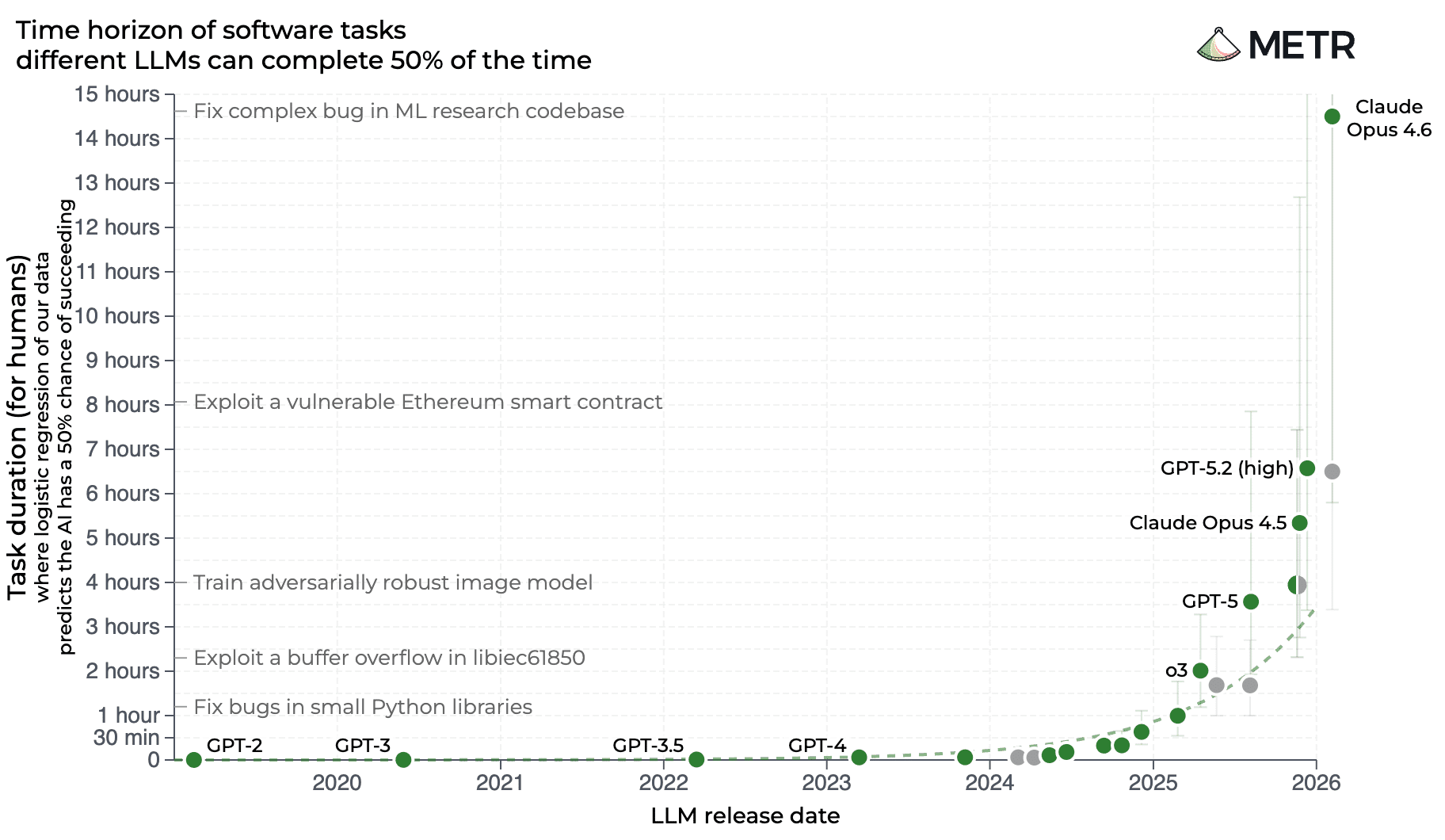 AIが人間の助けなしに作業を続けられる時間を、モデルのリリース日順に並べると、きれいな指数関数曲線を描きます。2020年には数分だった自律稼働時間が、2024年末に1時間を超え、2026年2月、Claude Opus 4.6で14.5時間に到達しました。グラフ上では急速な指数成長が続いています。