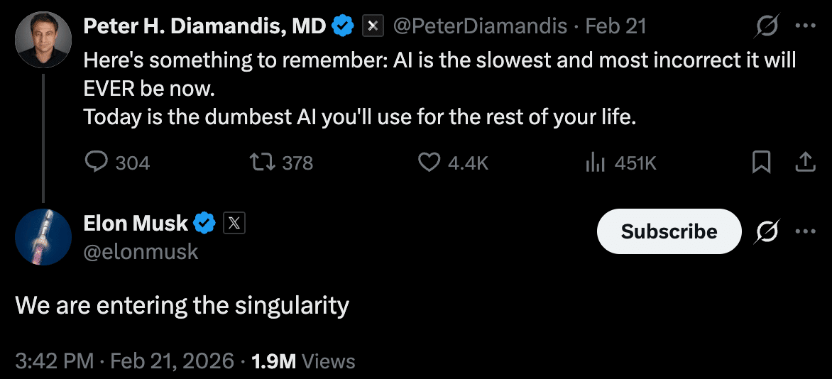 Peter Diamandis氏の「今日のAIは、あなたが今後使うAIの中で最も遅く不正確なものだ」という投稿に対し、Elon Musk氏は端的にこう返しました。「We are entering the singularity」。