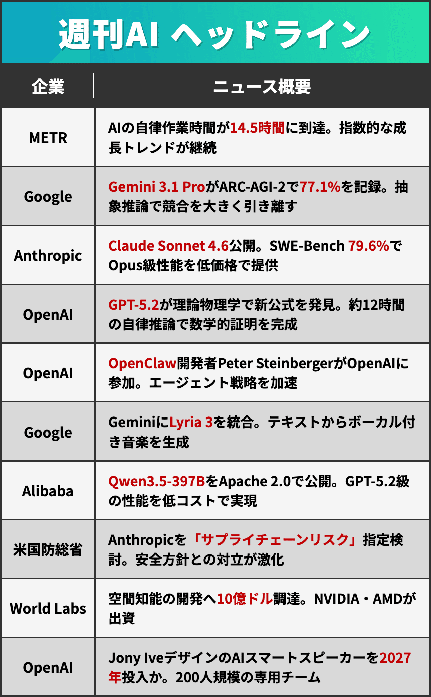 Gemini 3.1 Proの推論ベンチ77%超、GPT-5.2の理論物理学での自律的な新発見、Sonnet 4.6によるOpus級性能の低コスト提供。個々のニュースを俯瞰すると、すべてが1本の指数曲線の上に位置していることがわかります。今週はその加速の中で起きた出来事をお伝えします。