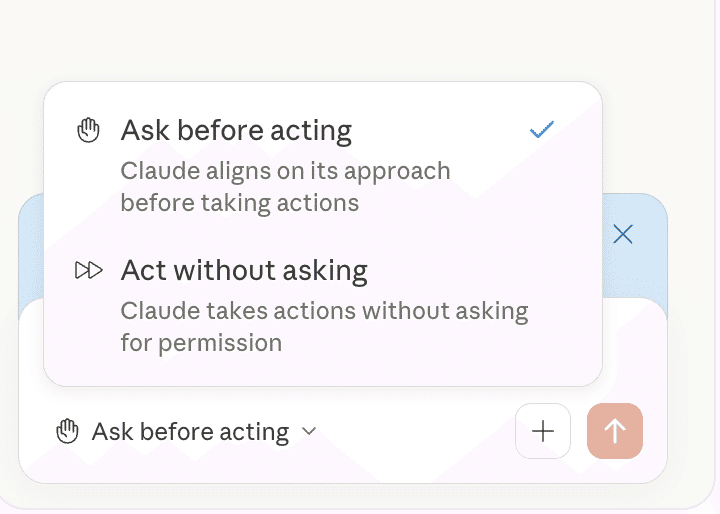 Claudeが行動計画(Plan)を提示し、ユーザーが承認(Approve)してから実行するモード。 基本的にはこのモードの使用を強く推奨します。 特に初めて訪れるサイトや、重要なデータを扱う場面では必須です。Act without asking: