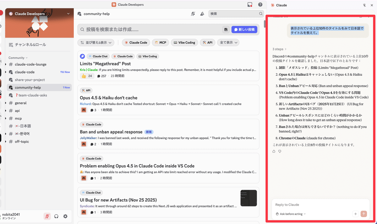 権限の許可: 初回起動時、ブラウザ操作に必要な権限(Permissions)のリクエストが表示されるので許可すると、右側にチャット欄が現れてそこからブラウザへの指示が行えるようになります。