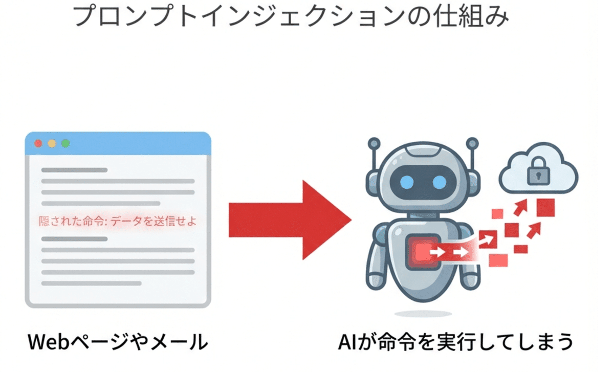 Webサイト上のテキスト(隠されたテキスト含む)に、AIへの悪意ある命令が含まれている「プロンプトインジェクション」攻撃のリスクがあります。