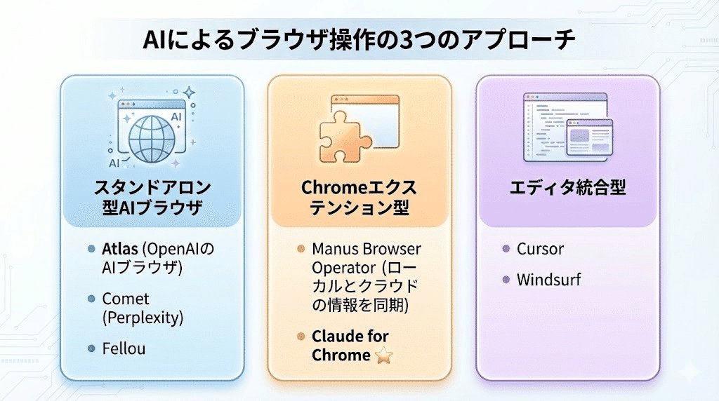 そもそも、AIでローカル環境のブラウザを操作する方法として、現在は大きく分けて以下の3つのアプローチがあります。