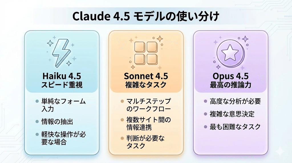 デフォルト設定。高速でレスポンスが良く、軽快なブラウザ操作を実現します。Sonnet 4.5: