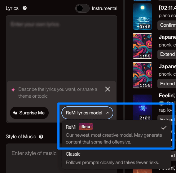「Describe the lyrics you want, or share a theme or topic.」と書かれたテキストエリア、または「Surprise Me」ボタンが表示されていることを確認し、「ReMi lyrics model」→ 「ReMi」を選択します。