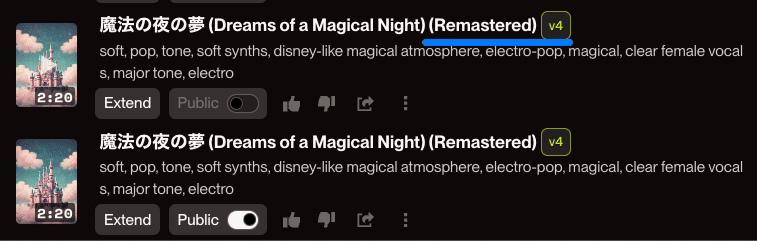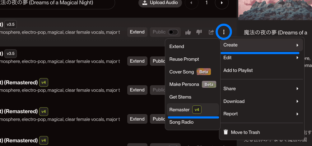 Suno v4では、v4以前に作成した既存の楽曲の音質を向上させる「Remaster」機能が追加されました。