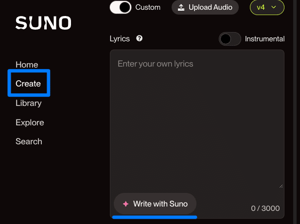 ② Lyrics by ReMiを選択: 「Write with Suno」ボタンをクリックすると、歌詞生成オプションが表示されます。