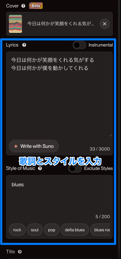 ② 歌詞とスタイルの入力: カバー曲で適用したい歌詞と曲のスタイルを入力します。
