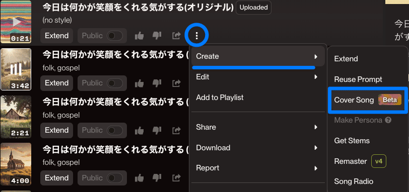 ① 音源の準備: アップロード、またはライブラリから音源を選択します。選択した音源を右クリック、または縦の「…」をクリックし、「Create」>「Cover Song」を選択します。