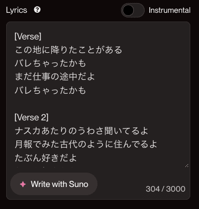 ※ただし、現状、日本語の歌詞生成はまだ不得意なようです。生成される日本語歌詞は、不自然な場合が多いため、実用には難しいかもしれません。日本語の歌詞を作成したい場合は、ChatGPTなどの他のツールを活用するのがおすすめです。