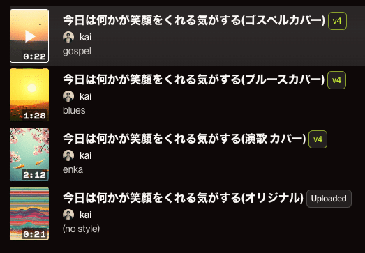 こちらのプレイリストが実際にアップロードしたボーカルのみの音声に様々なスタイルを適用した例です。