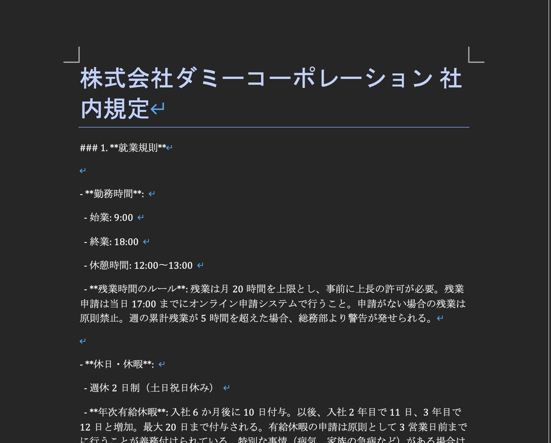 今回は例として、架空の会社の就業規則、人事関連規定、福利厚生規定などの社内規則に関する情報を学習させてみます。