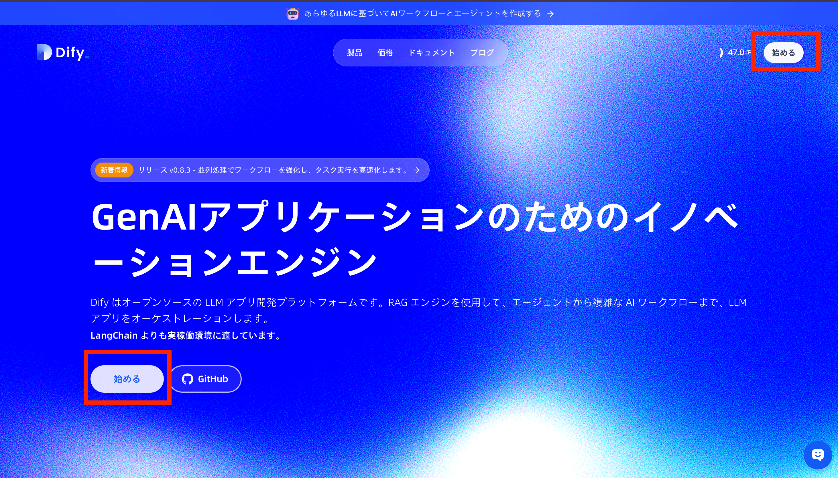 まずはDifyのウェブサイトにアクセスし、「始める」ボタンをクリックします。