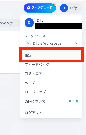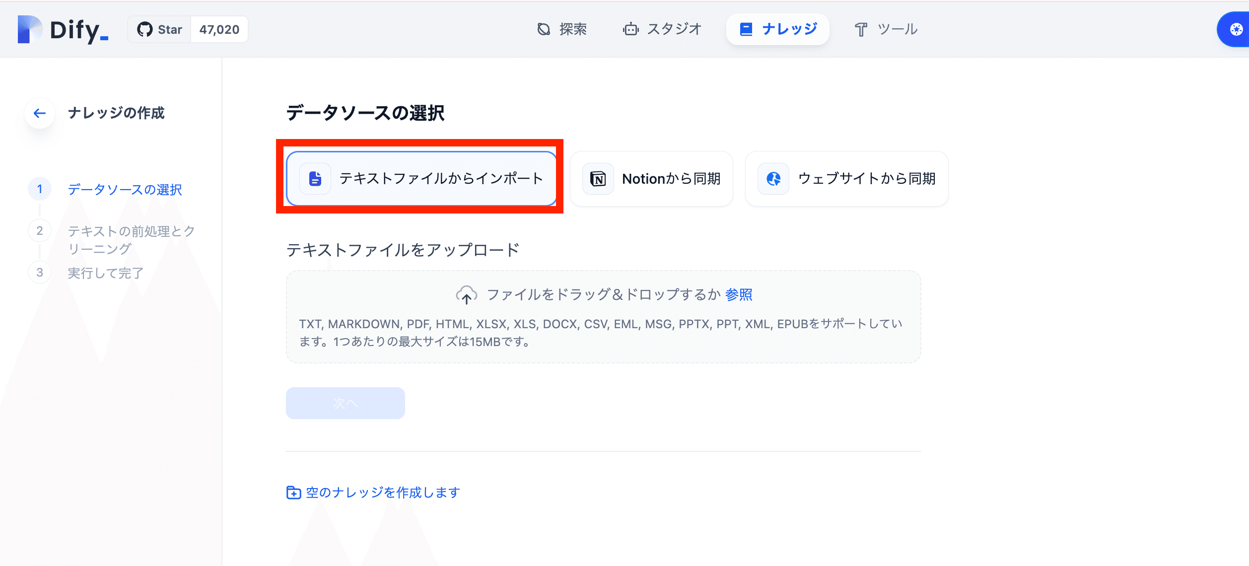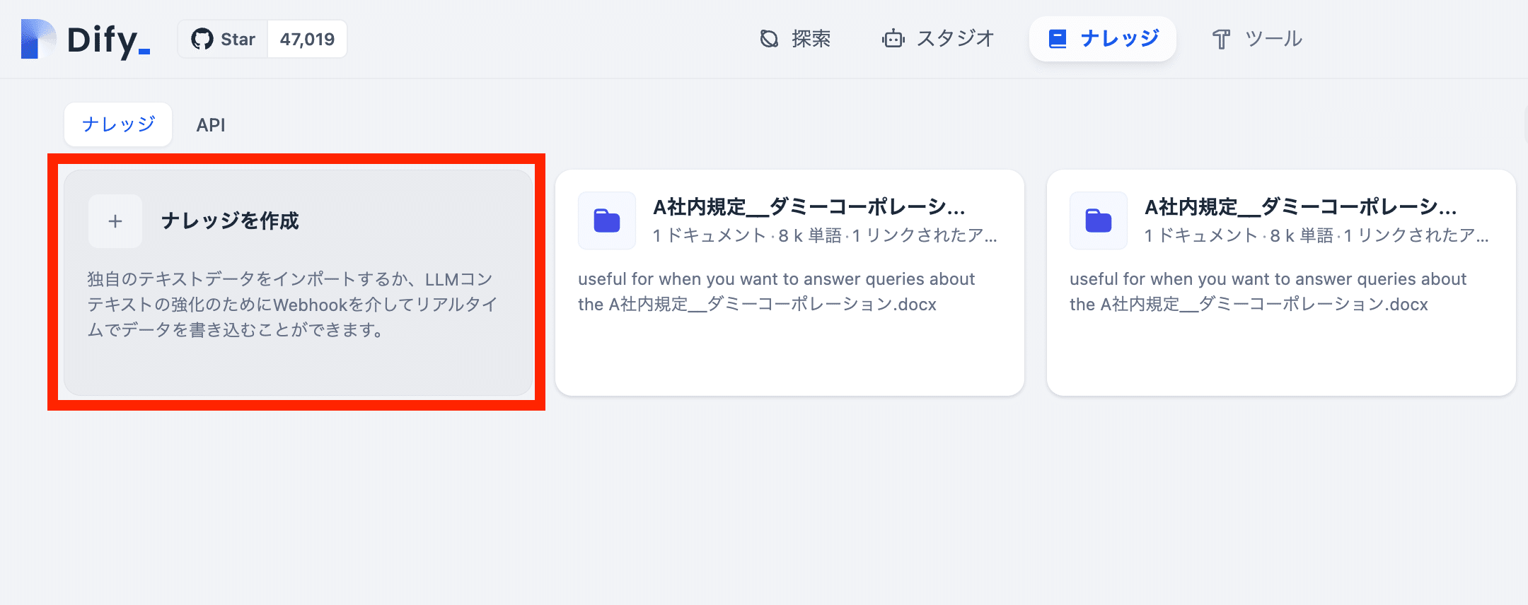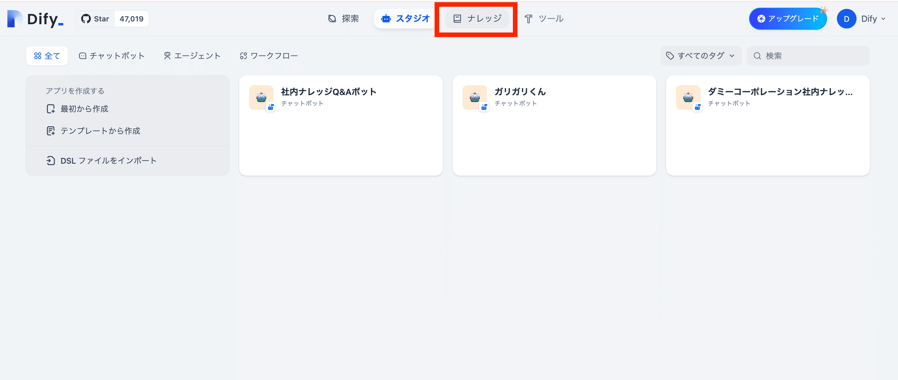 Difyのダッシュボード画面から「ナレッジ」を選択し、「ナレッジを作成」ボタンをクリックします。
