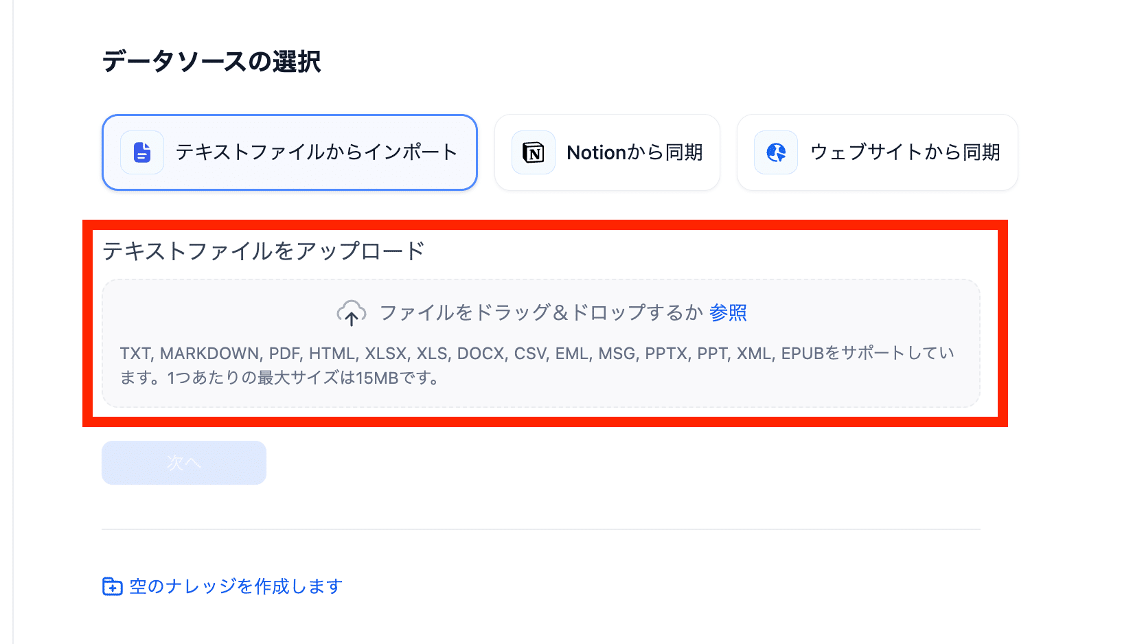 データソースの選択画面が表示され、今回はローカルにあるファイルを使用するので、「テキストファイルからインポート」を選択し、準備した社内ナレッジデータをアップロードします。