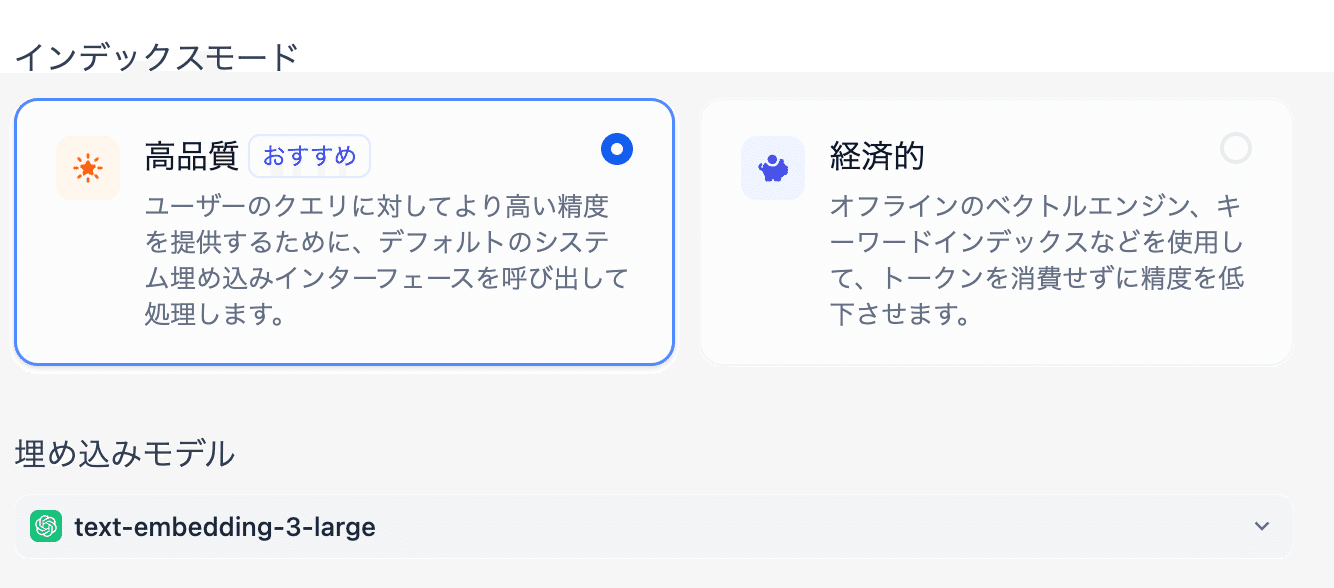 インデックスモード、埋め込みモデルはそれぞれ下記の写真の通りに設定してください。