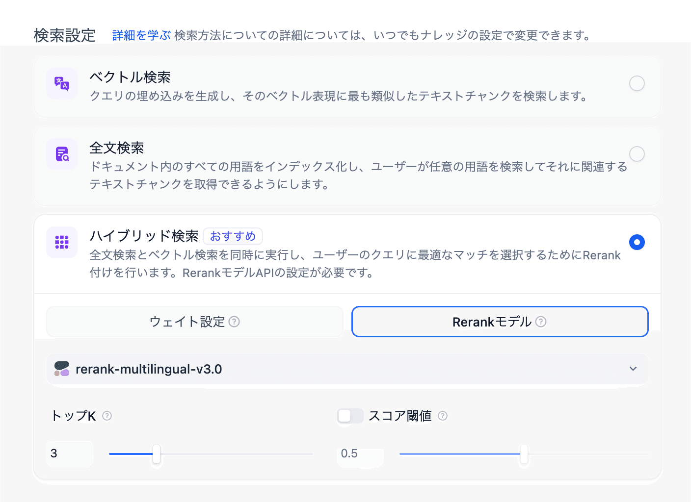 今回はハイブリッド検索を選択し、ベクトル検索モデルとRerankモデルをそれぞれ選択します。