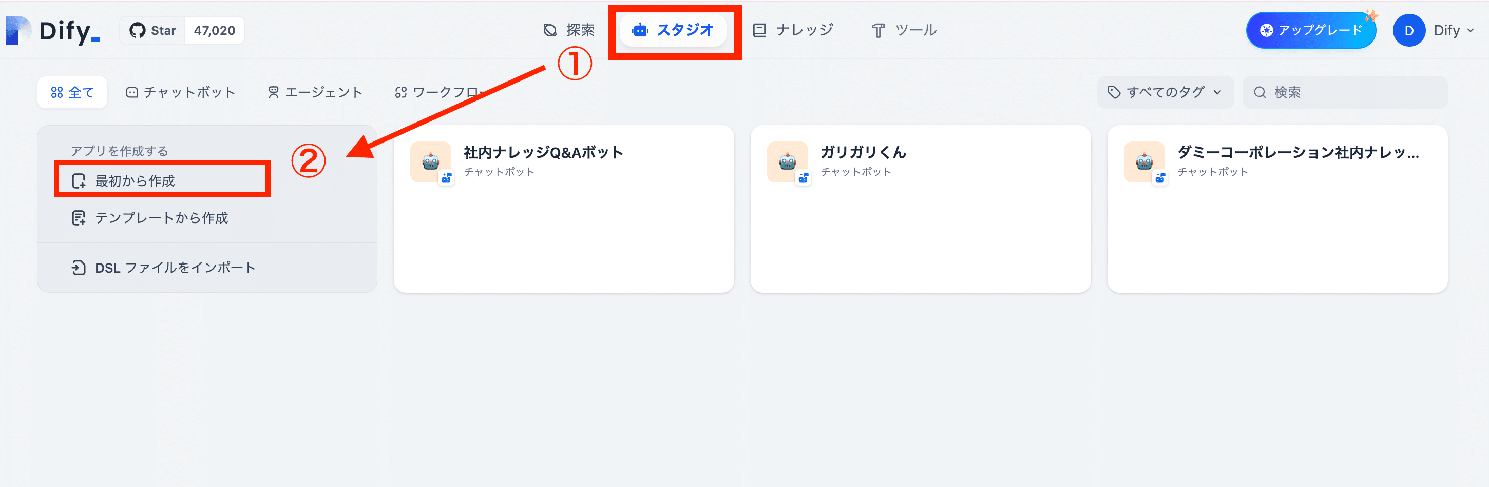 いよいよQ&Aボットの作成です。Difyのダッシュボード画面に戻り、「スタジオ」を選択し、「アプリを作成する」の「最初から作成」ボタンをクリックします。