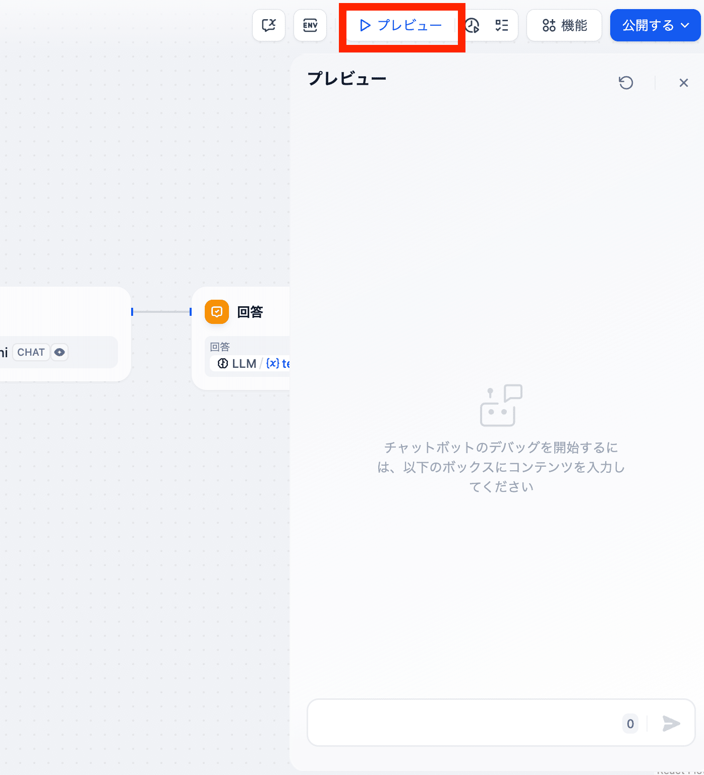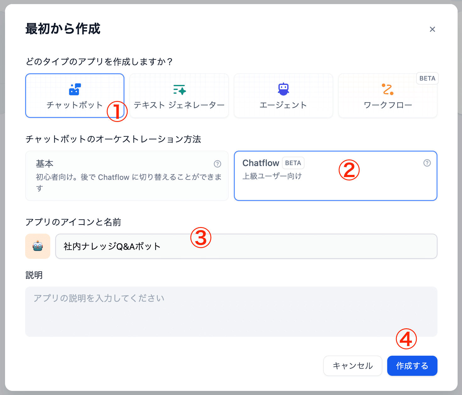 今回の記事では、「ChatFlow」を選択していますが、記事と同様の内容は「基本」からでも作成可能です。