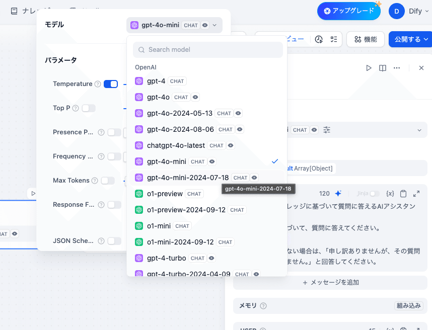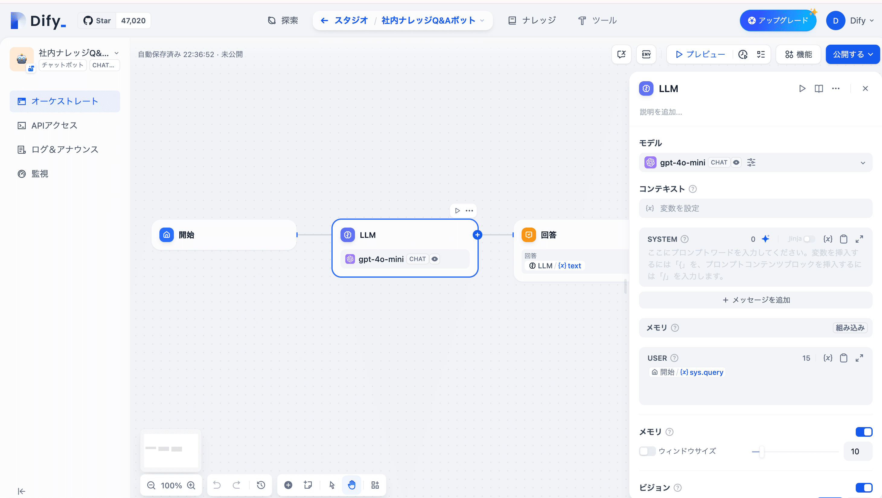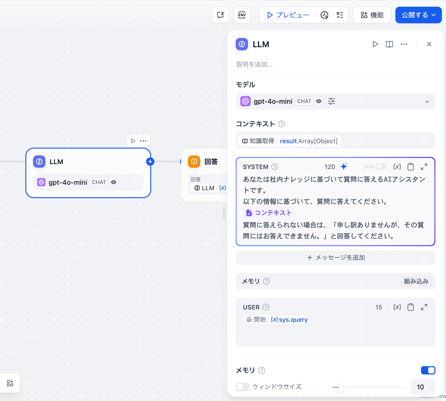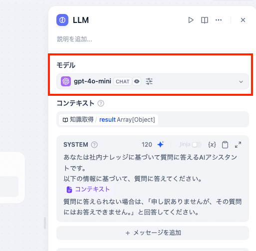 ※今回はgpt-4o-miniを使用していますが、LLMに関しては、OpenAIまたはGeminiなど、任意でご設定いただいても問題ありません。