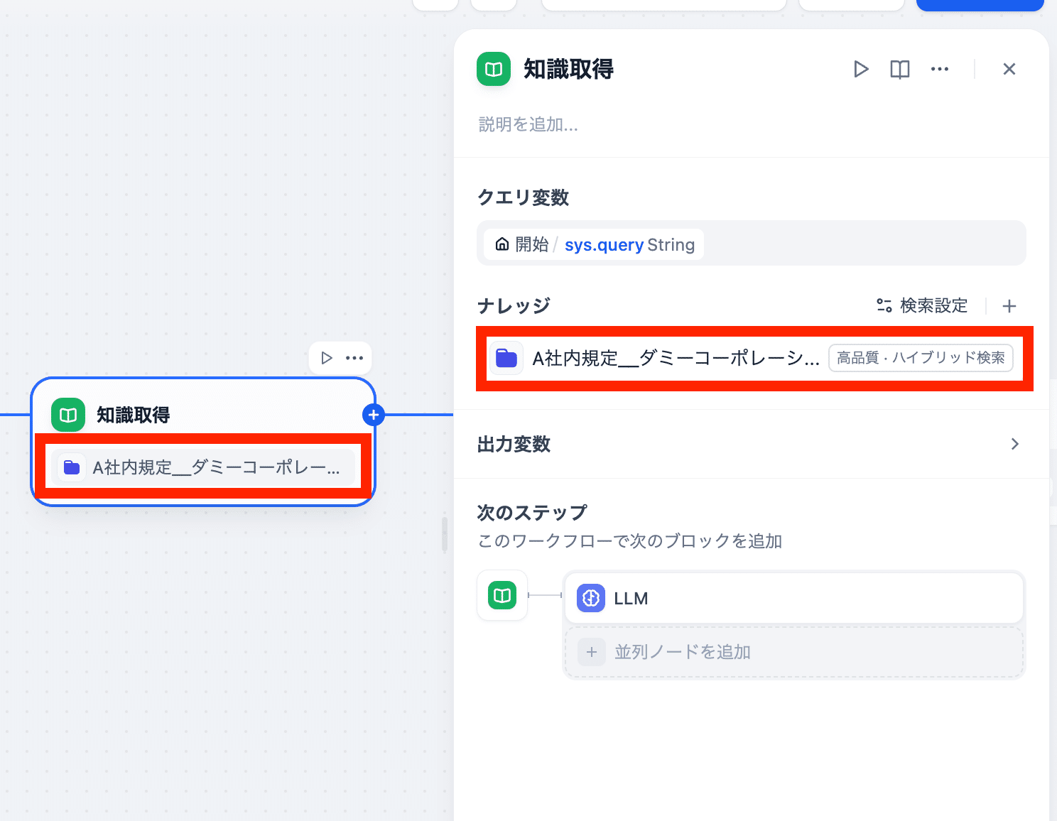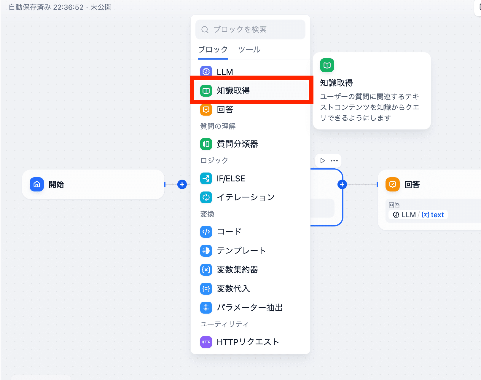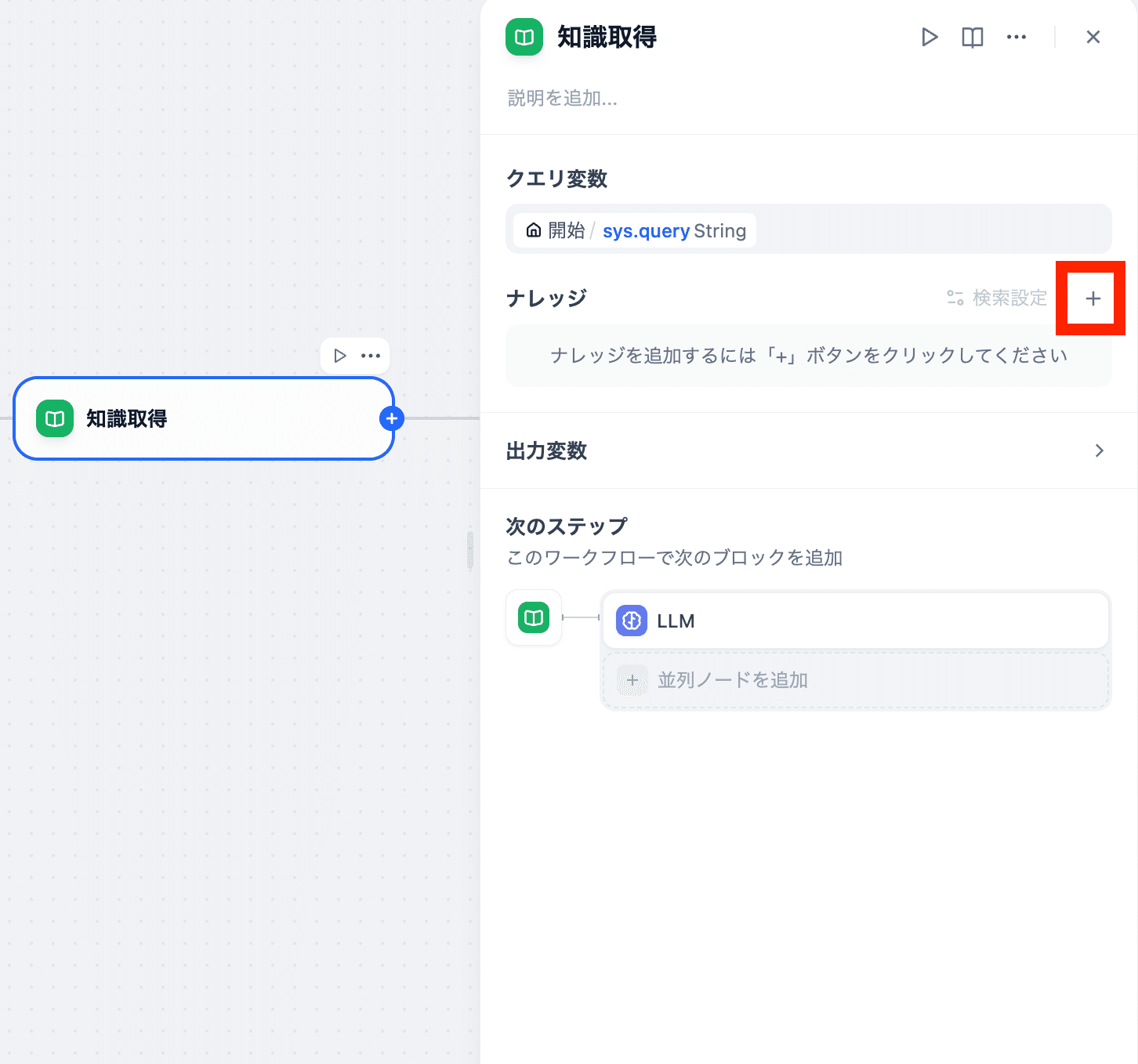 「開始」と「LLM」をつなぐ線の上にカーソルを持ってくると「+」ボタンが出てくるのでクリックして、「知識取得」を選択します。