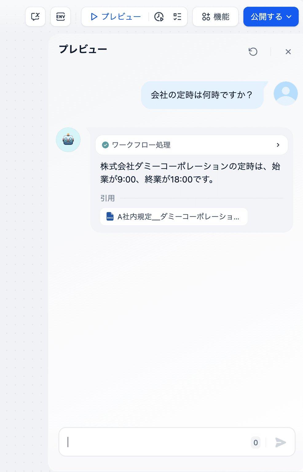 ボットの設定が完了したら、実際に質問してテストしてみましょう。「プレビュー」タブで質問を入力し、「送信」ボタンをクリックします。ボットが設定したプロンプトと社内ナレッジデータに基づいて回答を生成します。