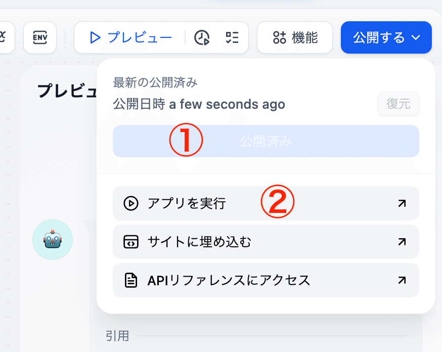 テストで無事に動くことが確認できたら、「公開する」タブから「公開」→「アプリを実行」をクリックすると、ブラウザ上でボットを使えるようになります。
