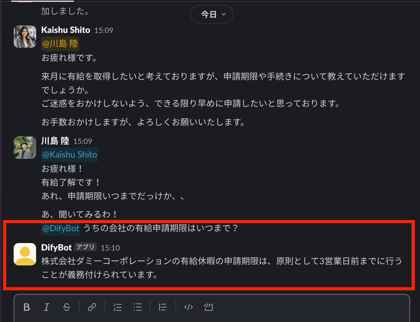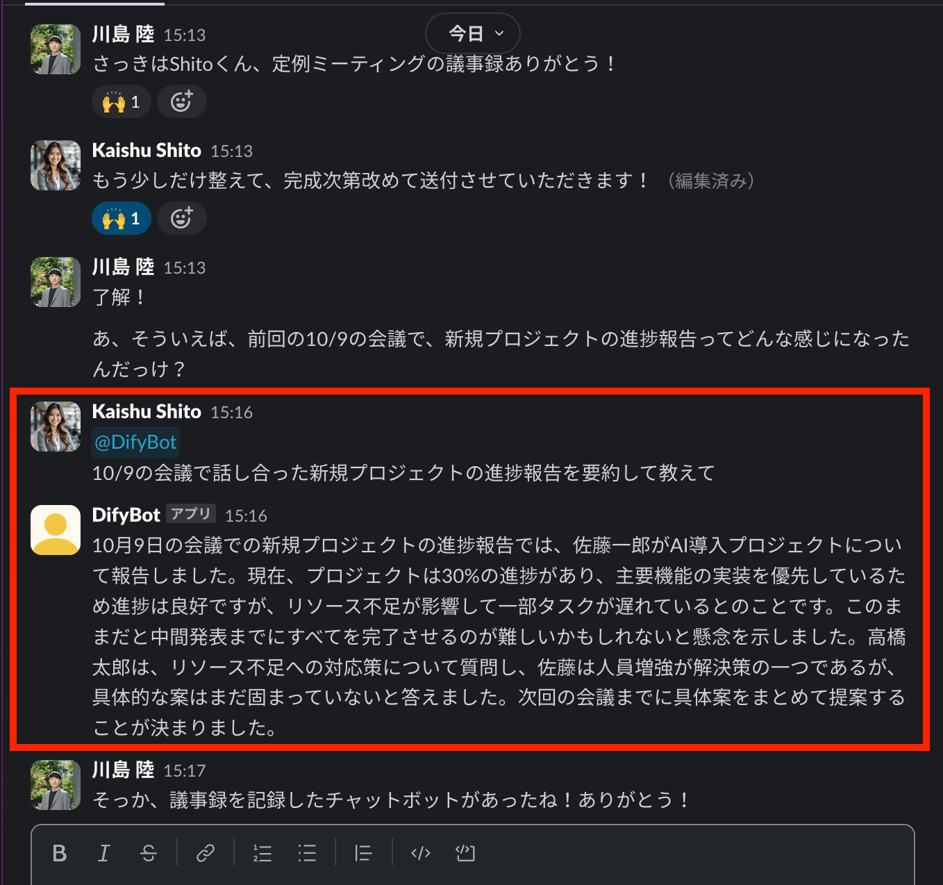 社内ナレッジの代わりに、議事録を学習したチャットボットを作成した場合、写真のように、担当プロジェクトのチャンネル内で、活用することもできてしまいます!