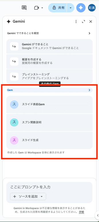 最近のアップデートにより、このサイドパネルからGem(カスタムAI)を直接呼び出せるようになりました。