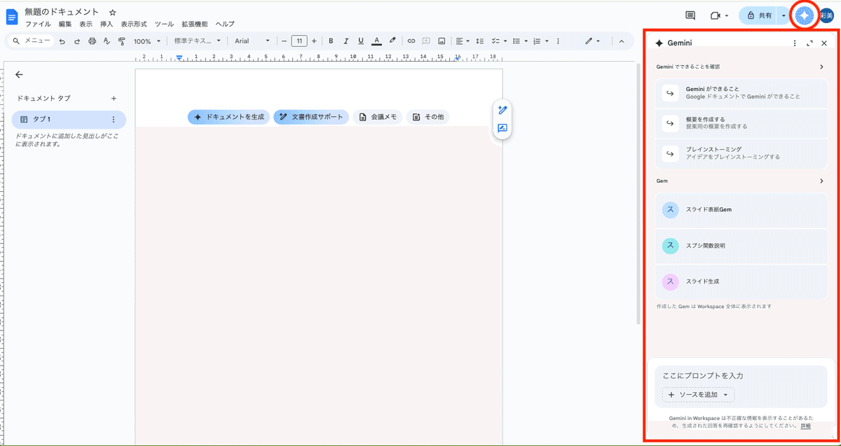 GmailやドキュメントなどのGoogle Workspaceアプリを開くと、画面右上にGeminiのアイコンが表示されます。