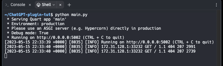 quart-cors次に、画面右側のShellタブでに pip install -r requirements.txt コマンドを実行し、上記のライブラリをインストールします。