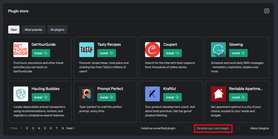 次に、ChatGPTのUIから、Plugin storeにアクセスし、Develop your own pluginを選択します。
