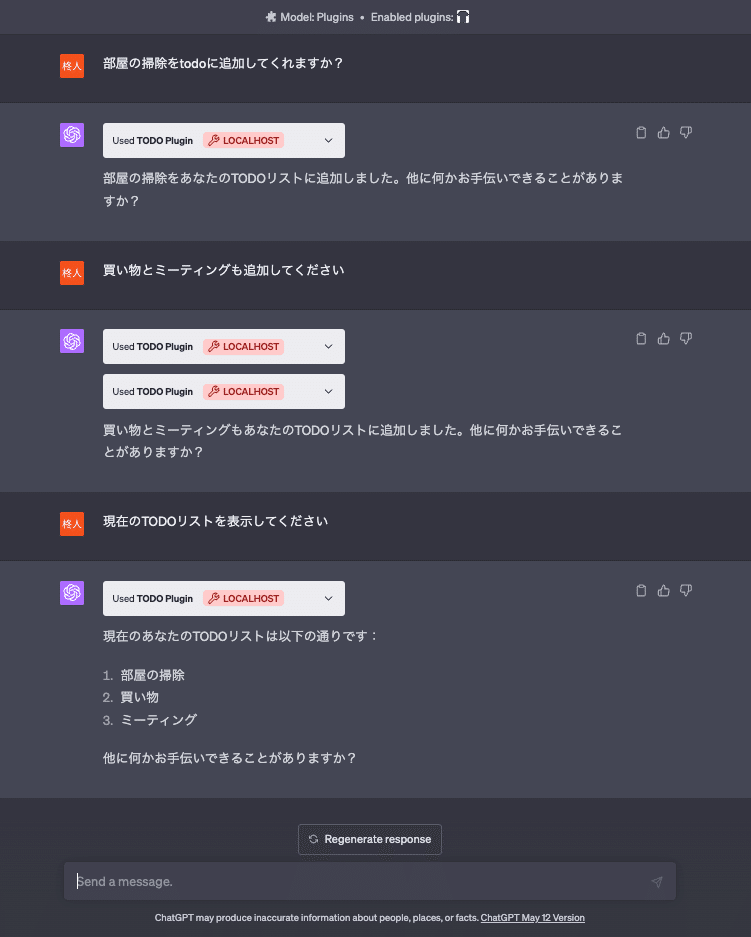 “description_for_model”に記載した内容に応じて、自動的にChatGPTがPluginを起動します。