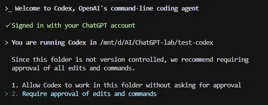 codex を起動して Sign in with ChatGPT を選びます。Plus / Pro / Team で最新モデル(gpt-5 含む)にアクセスできます。