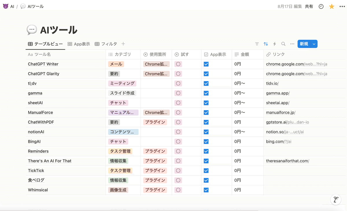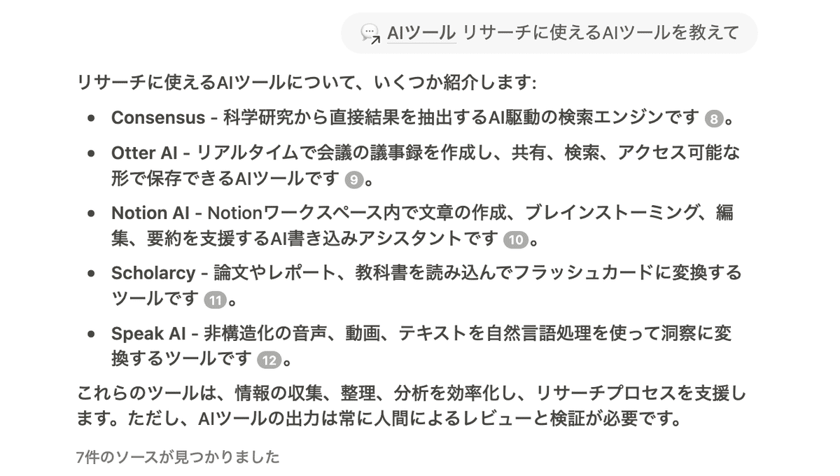 Notion内にAIツールのデータベースがあるため、そのデータベースを参照して業務で使えるAIツールの情報をまとめてもらいます。