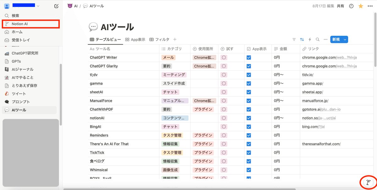 NotionAIのQ&A機能は、左のサイドバーか右下のアイコンマークをクリックすることで起動できます。