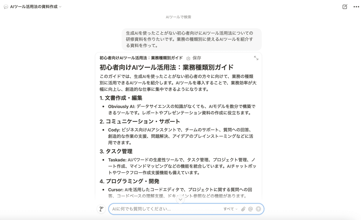 新入社員向けのAI研修の内容をNotion内のドキュメントを活用しながら、作成してみます。