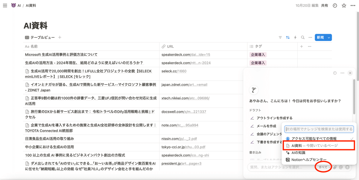 NotionAIを開いたチャットボックスの横の「すべて」をクリックすると、NotionAIで参照して欲しいページを指定できます。
